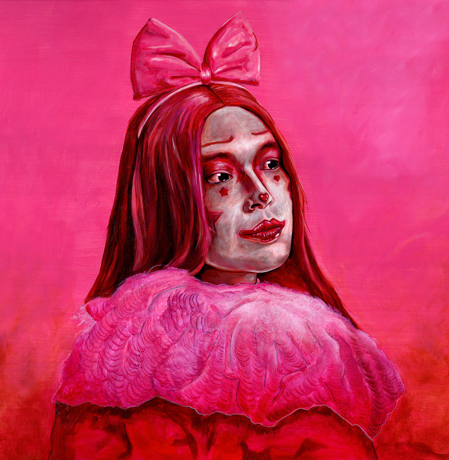 This painting depicts my friend, someone I once sold shoes with at a mall on the North Shore of Massachusetts. Back then, neither of us could have imagined where life would take her next. What started for her as a simple desire to keep three small balls in the air opened a hidden door. Juggling led to spinning plates, blowing harmonicas, and eventually to clowning, both on stage and at home with her playful toddler.